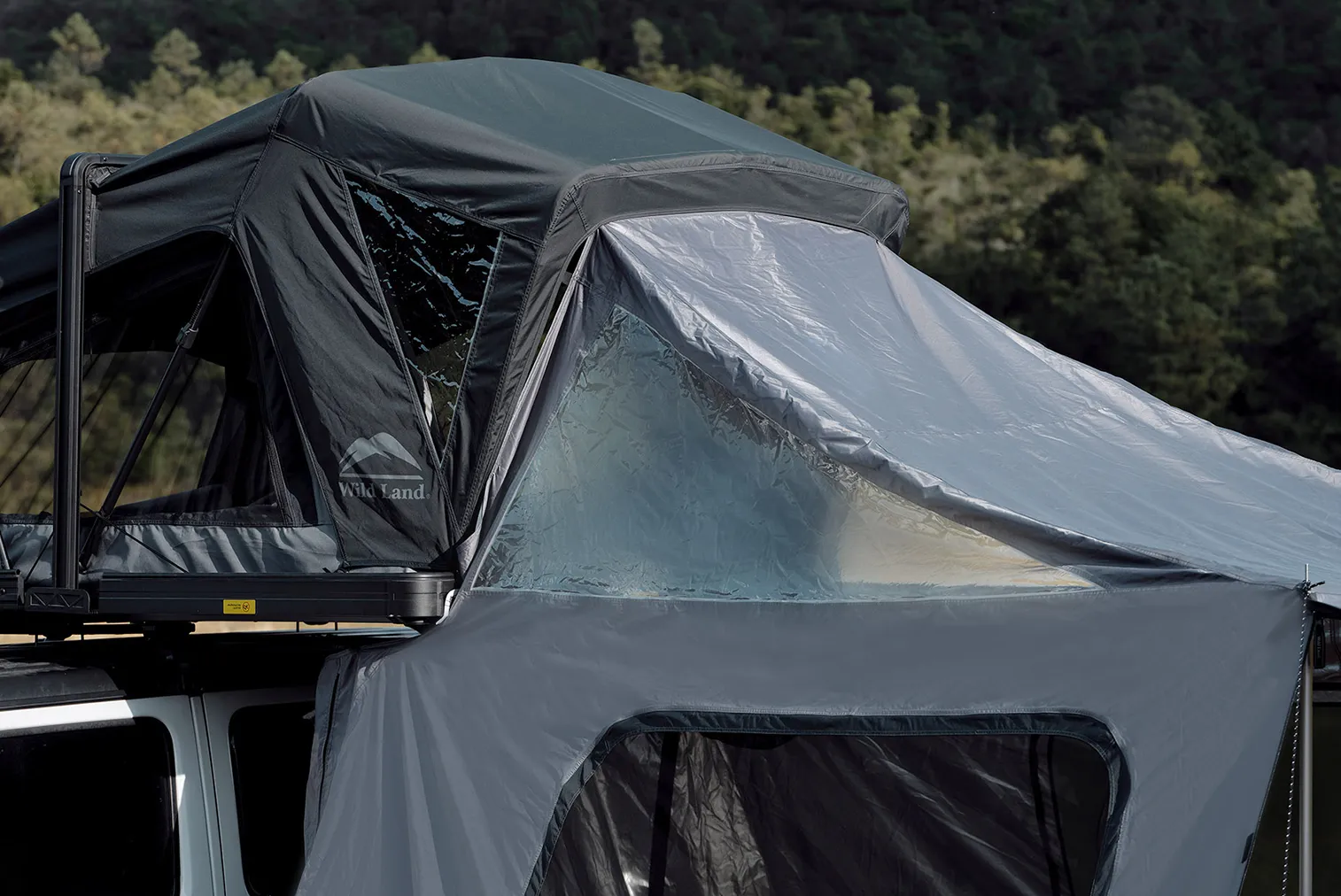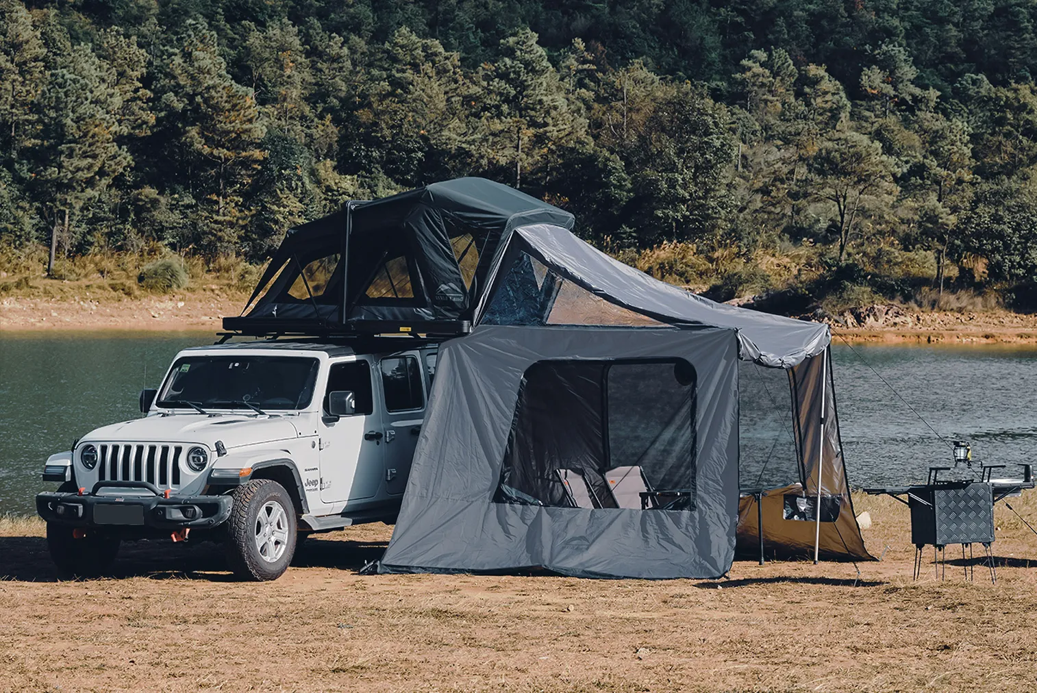 Exklusiver seitliches Anbauzelt mit einer maximalen Erweiterungsfläche von 9 m² bietet viel Platz für Aktivitäten am Boden.